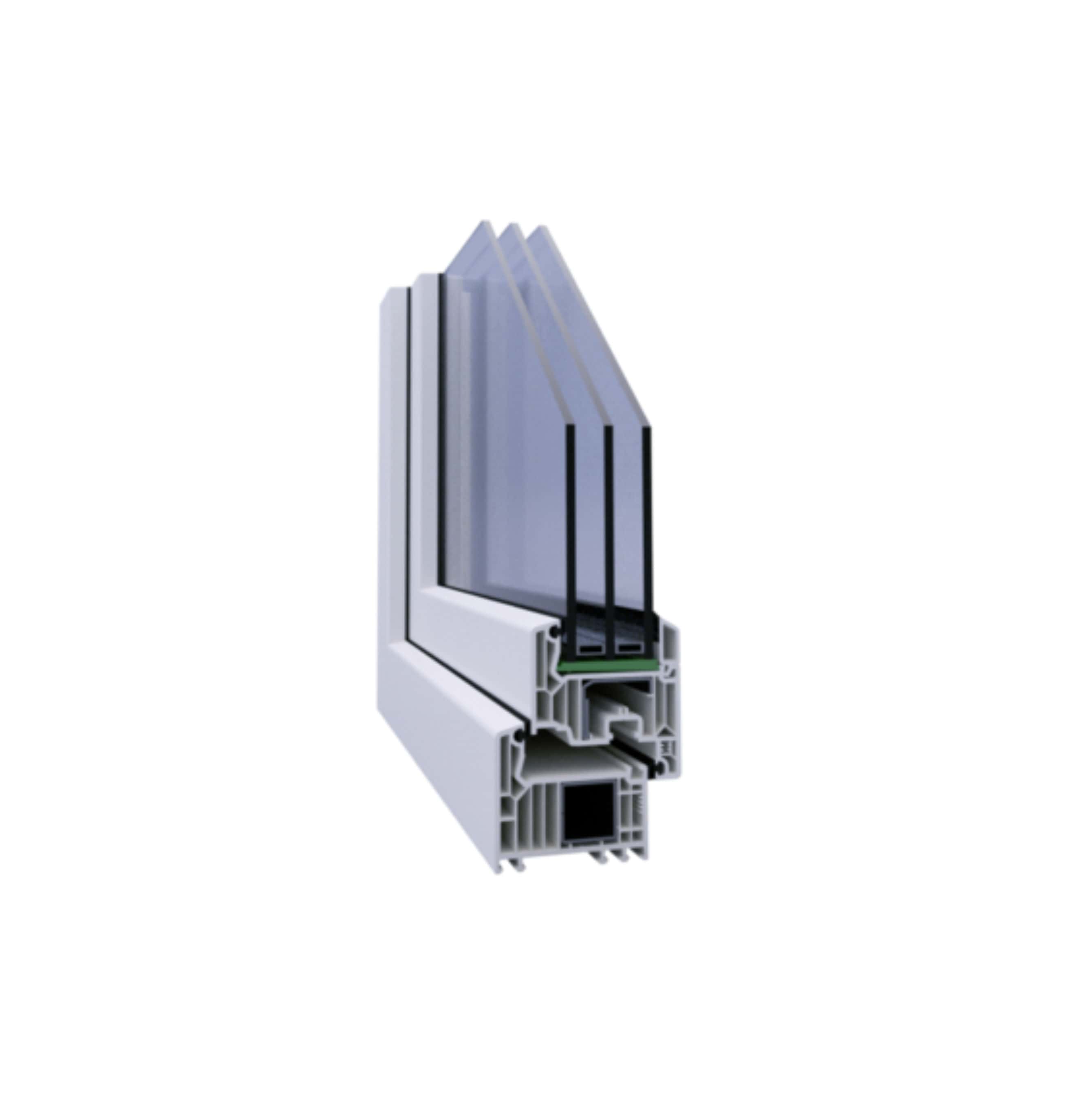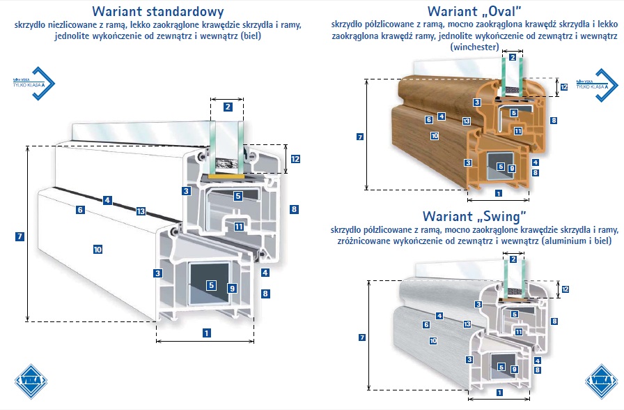 Grubość ścianek zewnętrznych profila wynosi 3 mm (z tolerancją 0,2 mm), czyli parametr spełniający najwyższe standardy RAL – „Klasa A*” (PN-EN 12608).Wariant standardowy z przylgowym systemem dwóchuszczelek (zewnętrznej i wewnętrznej). Wysokiej jakościtworzywo zapewnia długą żywotność uszczelek. Wariant standardowy z dodatkową uszczelką środkową to układ trzech uszczelek (zewnętrznej, środkowej i wewnętrznej) doskonale izolujący hałas, zimno, wilgoć i przeciągi. Uszczelka środkowa pewnie zamocowana do ramy.